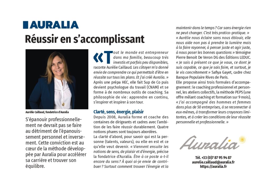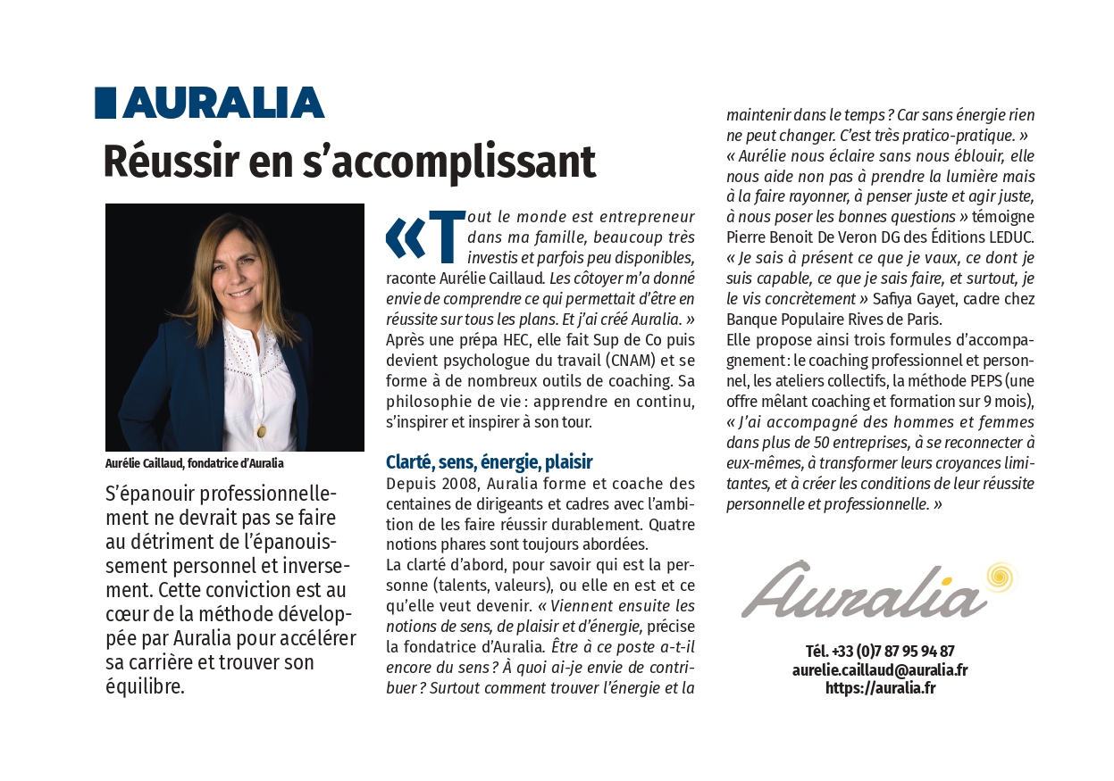 « Tout le monde est entrepreneur dans ma famille, beaucoup très investis et parfois peu disponibles, raconte Aurélie Caillaud. Les côtoyer m’a donné envie de comprendre ce qui permettait d’être en réussite sur tous les plans. Et j’ai créé Auralia. «